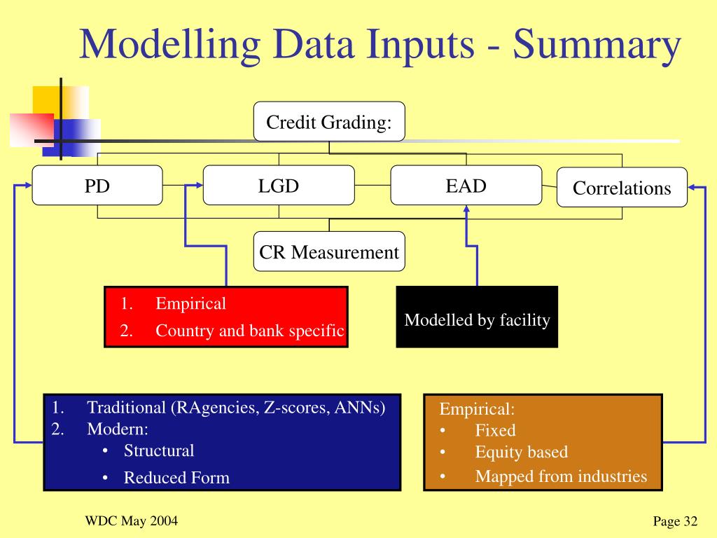 Modelling Data Inputs - Summary Credit Grading: PD LGD EAD Correlations CR Measurement Empirical Country and bank specific Modelled by facility • Traditional (RAgencies, Z-scores, ANNs) • Modern: • Structural • Reduced Form Empirical: • Fixed • Equity based • Mapped from industries