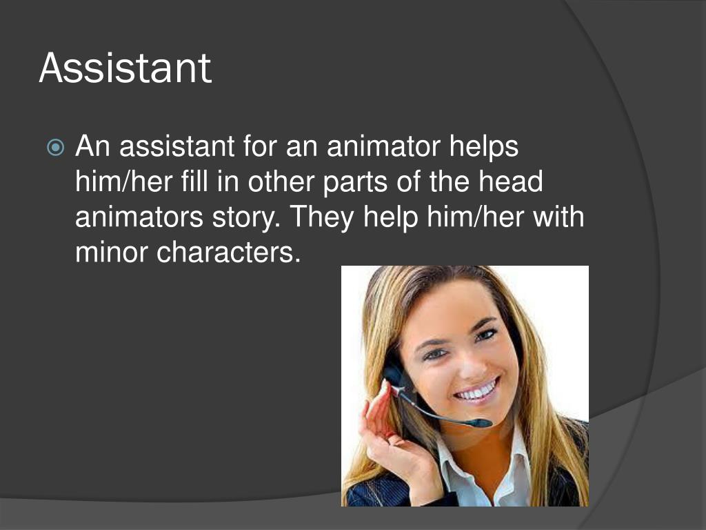Assistant • An assistant for an animator helps him/her fill in other parts of the head animators story. They help him/her with minor characters.