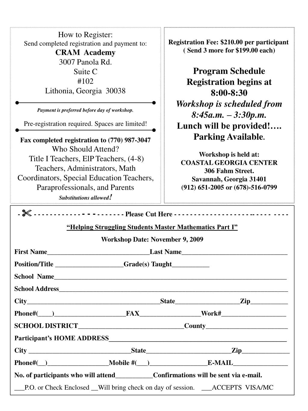 How to Register: Send completed registration and payment to: CRAM Academy 3007 Panola Rd. Suite C #102 Lithonia, Georgia 30038 Payment is preferred before day of workshop. Pre-registration required. Spaces are limited! Fax completed registration to (770) 987-3047 Who Should Attend? Title I Teachers, ElP Teachers, (4-8) Teachers, Administrators, Math Coordinators, Special Education Teachers, Paraprofessionals, and Parents Substitutions allowed! Registration Fee: $210.00 per participant ( Send 3 more for $199.00 each) Program Schedule Registration begins at 8:00-8:30 Workshop is scheduled from 8:45a.m. – 3:30p.m. Lunch will be provided!…. Parking Available. Workshop is held at: COASTAL GEORGIA CENTER 306 Fahm Street. Savannah, Georgia 31401 (912) 651-2005 or (678)-516-0799 - - - - - - - - - - - - - - - - - - - - - - - Please Cut Here - - - - - - - - - - - - - - - - - - - -- - - - - - - - - “Helping Struggling Students Master Mathematics Part I” Workshop Date: November 9, 2009 First Name______________________________Last Name_______________________________ Position/Title ____________________Grade(s) Taught___________ School Name____________________________________________________________________ School Address___________________________________________________________________ City_______________________________________State___________________Zip___________ Phone#(____)_____________________FAX__________________Work#___________________ SCHOOL DISTRICT_______________________________County________________________ Participant’s HOME ADDRESS____________________________________________________ City ______________________________State_________________________Zip______________ Phone#(__)__________________Mobile #(___)_________________E-MAIL________________ No. of participants who will attend___________Confirmations will be sent via e-mail. ___P.O. or Check Enclosed__Will bring check on day of session. ___ACCEPTS VISA/MC