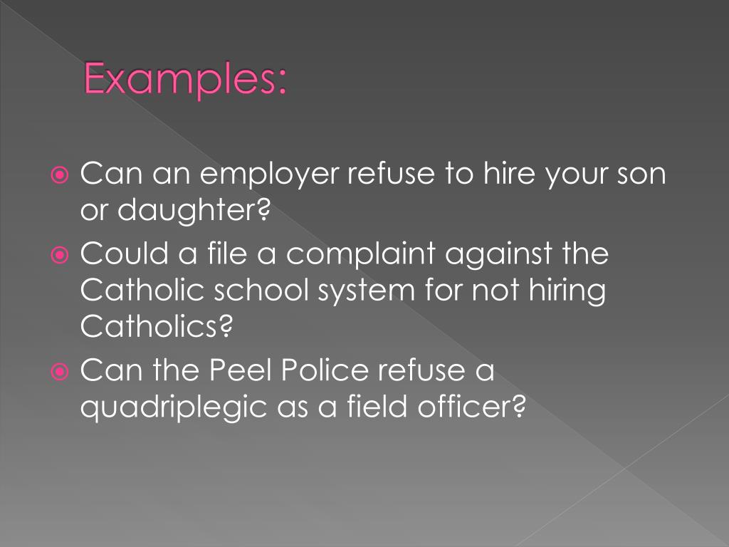 Examples: • Can an employer refuse to hire your son or daughter? • Could a file a complaint against the Catholic school system for not hiring Catholics? • Can the Peel Police refuse a quadriplegic as a field officer?