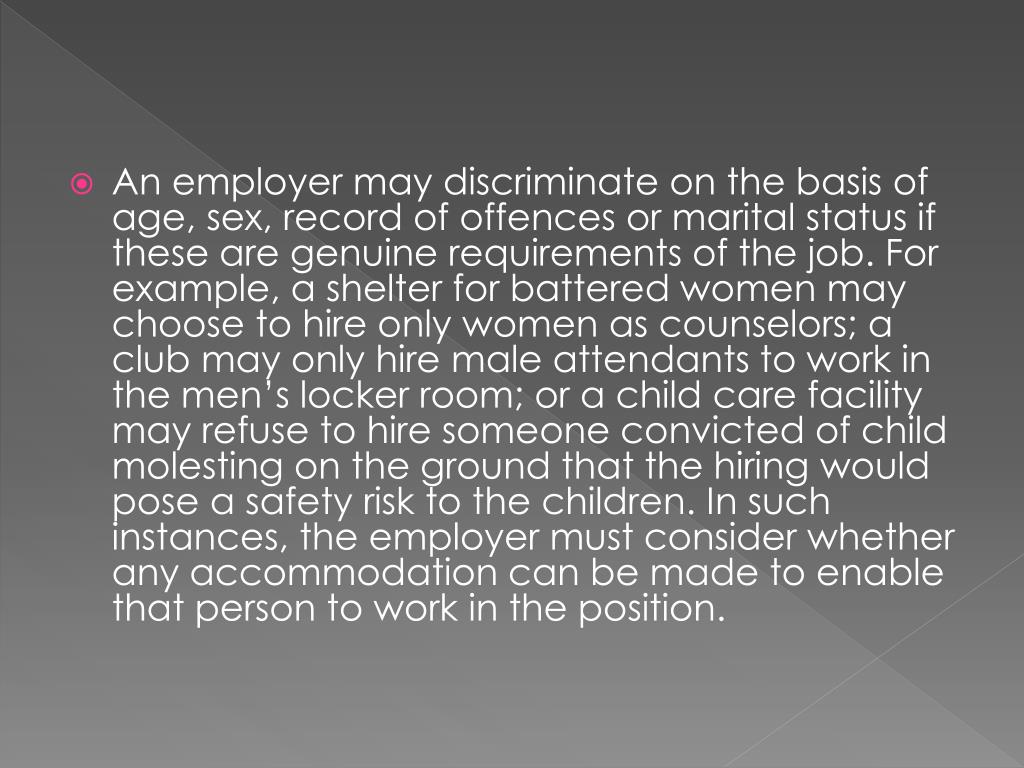 An employer may discriminate on the basis of age, sex, record of offences or marital status if these are genuine requirements of the job. For example, a shelter for battered women may choose to hire only women as counselors; a club may only hire male attendants to work in the men’s locker room; or a child care facility may refuse to hire someone convicted of child molesting on the ground that the hiring would pose a safety risk to the children. In such instances, the employer must consider whether any accommodation can be made to enable that person to work in the position.