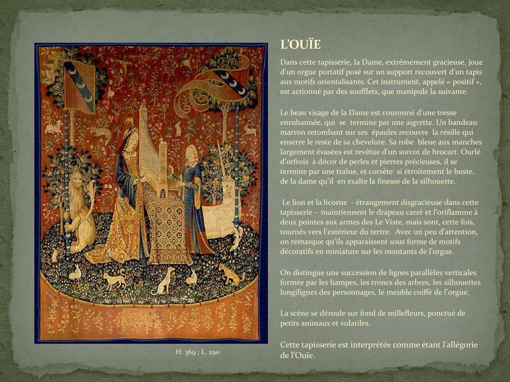 L’OUΪE Dans cette tapisserie, la Dame, extrêmement gracieuse, joue d’un orgue portatif posé sur un support recouvert d’un tapis aux motifs orientalisants. Cet instrument, appelé « positif », est actionné par des soufflets, que manipule la suivante. Le beau visage de la Dame est couronné d’une tresse enrubannée, qui se termine par une aigrette. Un bandeau marron retombant sur ses épaules recouvre la résille qui enserre le reste de sa chevelure. Sa robe bleue aux manches largement évasées est revêtue d’un surcot de brocart. Ourlé d’orfrois à décor de perles et pierres précieuses, il se termine par une traîne, et corsète si étroitement le buste, de la dame qu’il en exalte la finesse de la silhouette. Le lion et la licorne - étrangement disgracieuse dans cette tapisserie - maintiennent le drapeau carré et l’oriflamme à deux pointes aux armes des Le Viste, mais sont, cette fois, tournés vers l’extérieur du tertre. Avec un peu d’attention, on remarque qu’ils apparaissent sous forme de motifs décoratifs en miniature sur les montants de l'orgue. On distingue une succession de lignes parallèles verticales formée par les hampes, les troncs des arbres, les silhouettes longilignes des personnages, le meuble coiffé de l’orgue. La scène se déroule sur fond de millefleurs, ponctué de petits animaux et volatiles. Cette tapisserie est interprétée comme étant l’allégorie de l’Ouïe. H. 369 ; L. 290