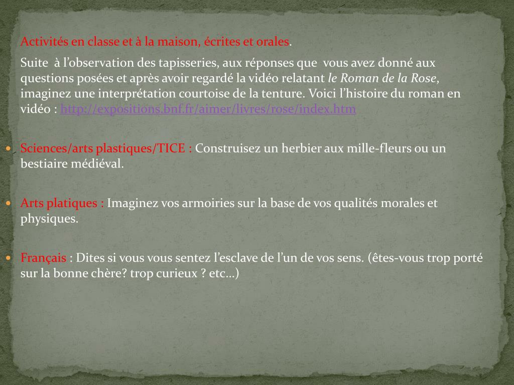 Activités en classe et à la maison, écrites et orales. Suite à l’observation des tapisseries, aux réponses que vous avez donné aux questions posées et après avoir regardé la vidéo relatant le Roman de la Rose, imaginez une interprétation courtoise de la tenture. Voici l’histoire du roman en vidéo : http://expositions.bnf.fr/aimer/livres/rose/index.htm Sciences/arts plastiques/TICE : Construisez un herbier aux mille-fleurs ou un bestiaire médiéval. Arts platiques : Imaginez vos armoiries sur la base de vos qualités morales et physiques. Français : Dites si vous vous sentez l’esclave de l’un de vos sens. (êtes-vous trop porté sur la bonne chère? trop curieux ? etc…)