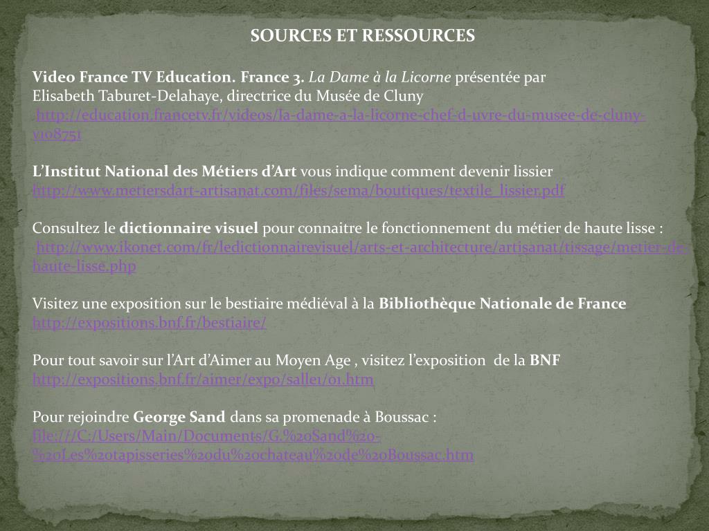 SOURCES ET RESSOURCES Video France TV Education. France 3.La Dame à la Licorne présentée par Elisabeth Taburet-Delahaye, directrice du Musée de Cluny http://education.francetv.fr/videos/la-dame-a-la-licorne-chef-d-uvre-du-musee-de-cluny-v108751 L’Institut National des Métiers d’Art vous indique comment devenir lissier http://www.metiersdart-artisanat.com/files/sema/boutiques/textile_lissier.pdf Consultez le dictionnaire visuel pour connaitre le fonctionnement du métier de haute lisse : http://www.ikonet.com/fr/ledictionnairevisuel/arts-et-architecture/artisanat/tissage/metier-de-haute-lisse.php Visitez une exposition sur le bestiaire médiéval à la Bibliothèque Nationale de France http://expositions.bnf.fr/bestiaire/ Pour tout savoir sur l’Art d’Aimer au Moyen Age , visitez l’exposition de la BNF http://expositions.bnf.fr/aimer/expo/salle1/01.htm Pour rejoindre George Sand dans sa promenade à Boussac : file:///C:/Users/Main/Documents/G.%20Sand%20-%20Les%20tapisseries%20du%20chateau%20de%20Boussac.htm