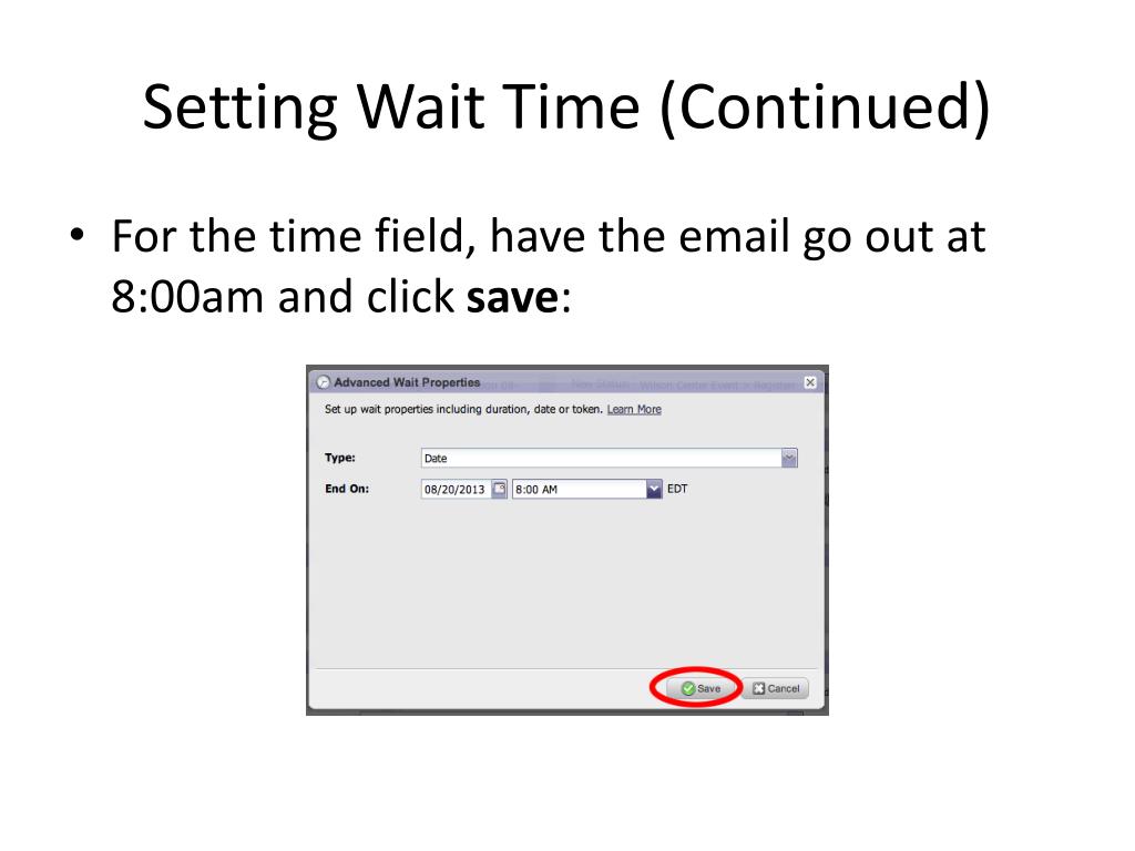 Setting Wait Time (Continued) • For the time field, have the email go out at 8:00am and click save: