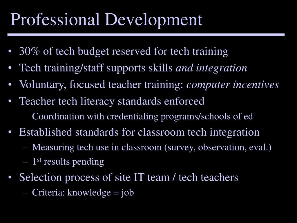 Professional Development • 30% of tech budget reserved for tech training • Tech training/staff supports skills and integration • Voluntary, focused teacher training: computer incentives • Teacher tech literacy standards enforced • Coordination with credentialing programs/schools of ed • Established standards for classroom tech integration • Measuring tech use in classroom (survey, observation, eval.) • 1st results pending • Selection process of site IT team / tech teachers • Criteria: knowledge = job