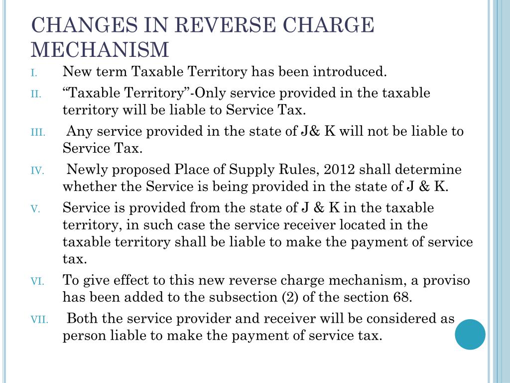 CHANGES IN REVERSE CHARGE MECHANISM • New term Taxable Territory has been introduced. • “Taxable Territory”-Only service provided in the taxable territory will be liable to Service Tax. • Any service provided in the state of J& K will not be liable to Service Tax. • Newly proposed Place of Supply Rules, 2012 shall determine whether the Service is being provided in the state of J & K. • Service is provided from the state of J & K in the taxable territory, in such case the service receiver located in the taxable territory shall be liable to make the payment of service tax. • To give effect to this new reverse charge mechanism, a proviso has been added to the subsection (2) of the section 68. • Both the service provider and receiver will be considered as person liable to make the payment of service tax.