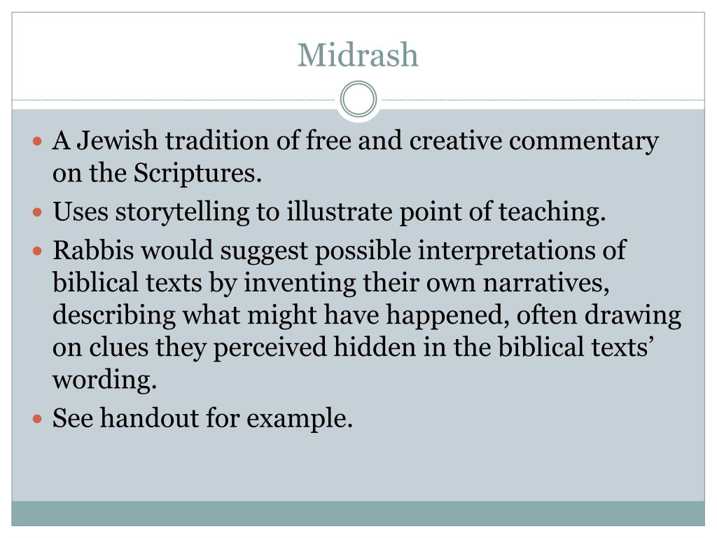 Midrash A Jewish tradition of free and creative commentary on the Scriptures. Uses storytelling to illustrate point of teaching. Rabbis would suggest possible interpretations of biblical texts by inventing their own narratives, describing what might have happened, often drawing on clues they perceived hidden in the biblical texts’ wording. See handout for example.