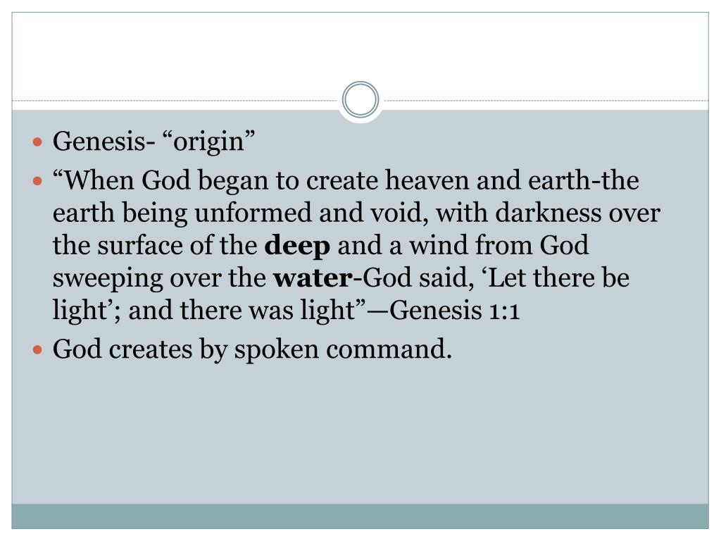 Genesis- “origin” “When God began to create heaven and earth-the earth being unformed and void, with darkness over the surface of the deep and a wind from God sweeping over the water-God said, ‘Let there be light’; and there was light”—Genesis 1:1 God creates by spoken command.