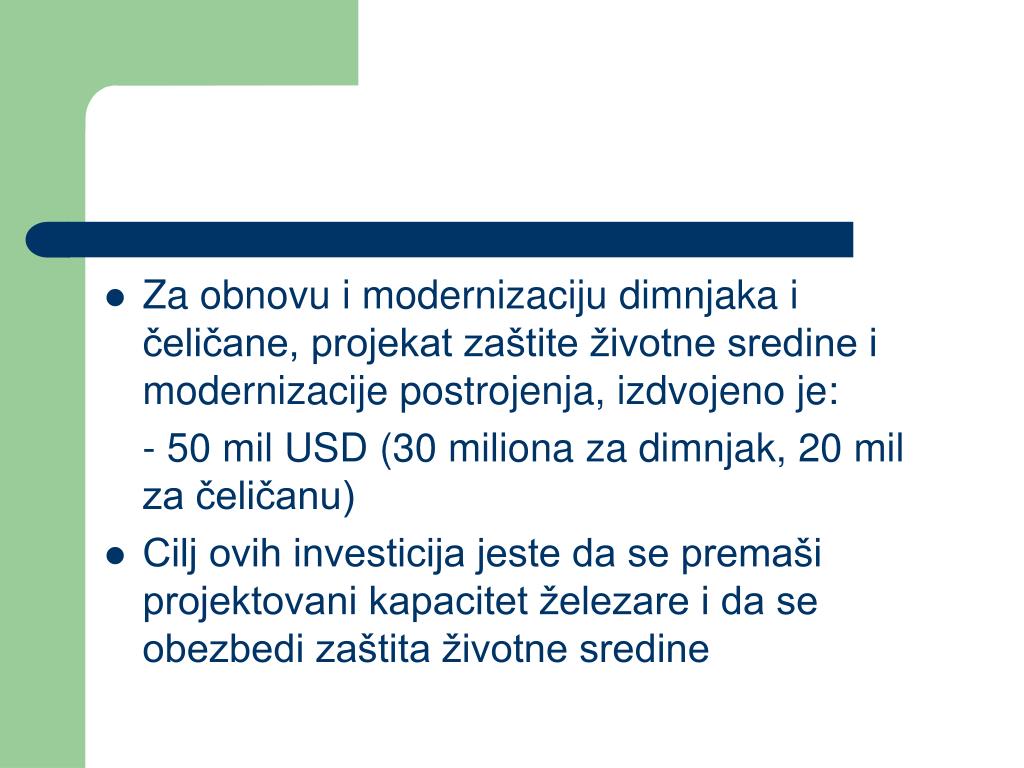 Za obnovu i modernizaciju dimnjaka i čeličane, projekat zaštite životne sredine i modernizacije postrojenja, izdvojeno je: - 50 mil USD (30 miliona za dimnjak, 20 mil za čeličanu) • Cilj ovih investicija jeste da se premaši projektovani kapacitet železare i da se obezbedi zaštita životne sredine