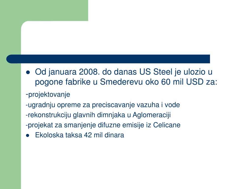 Od januara 2008. do danas US Steel je ulozio u pogone fabrike u Smederevu oko 60 mil USD za: -projektovanje -ugradnju opreme za preciscavanje vazuha i vode -rekonstrukciju glavnih dimnjaka u Aglomeraciji -projekat za smanjenje difuzne emisije iz Celicane • Ekoloska taksa 42 mil dinara