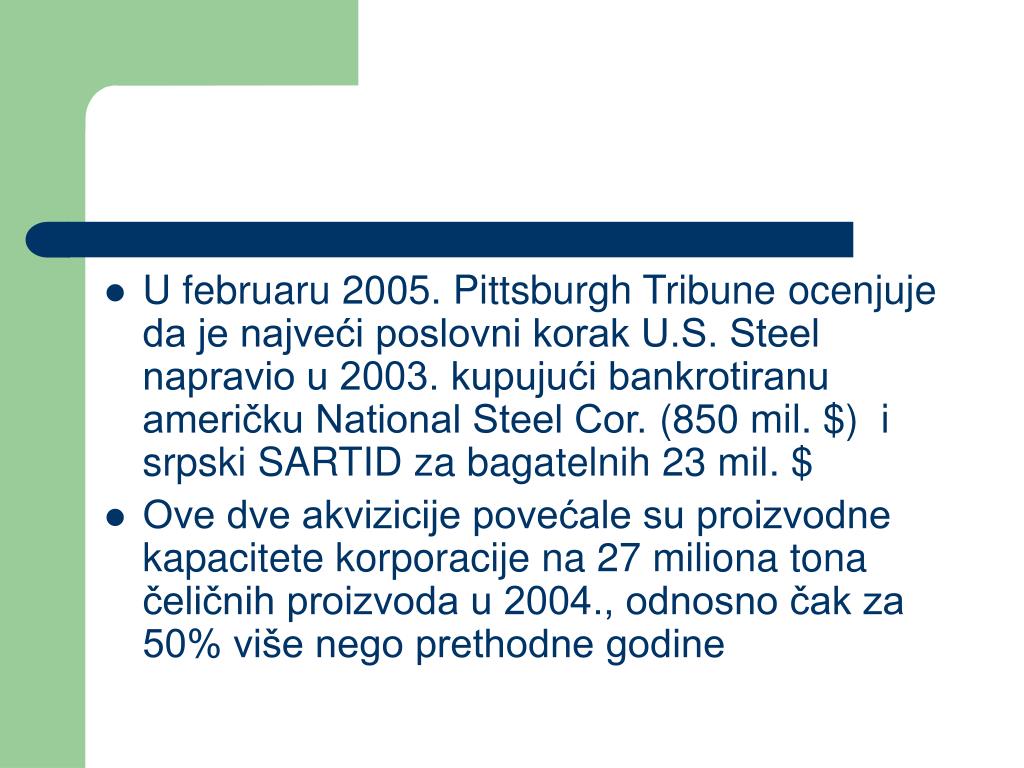 U februaru 2005. Pittsburgh Tribuneocenjuje da je najveći poslovni korak U.S. Steel napravio u 2003. kupujući bankrotiranu američku National Steel Cor. (850 mil. $) i srpski SARTID za bagatelnih 23 mil.$ • Ove dve akvizicije povećale su proizvodne kapacitete korporacije na 27 miliona tona čeličnih proizvoda u 2004., odnosno čak za 50% više nego prethodne godine