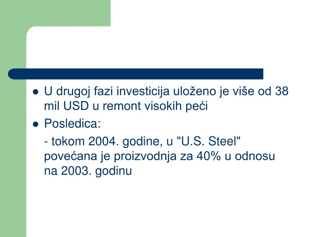 U drugoj fazi investicija uloženo je više od 38 mil USD u remont visokih peći • Posledica: - tokom 2004. godine, u "U.S. Steel" povećana je proizvodnja za 40% u odnosu na 2003. godinu