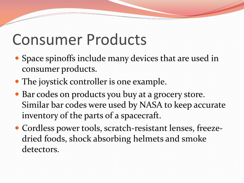 Consumer Products • Space spinoffs include many devices that are used in consumer products. • The joystick controller is one example. • Bar codes on products you buy at a grocery store. Similar bar codes were used by NASA to keep accurate inventory of the parts of a spacecraft. • Cordless power tools, scratch-resistant lenses, freeze-dried foods, shock absorbing helmets and smoke detectors.