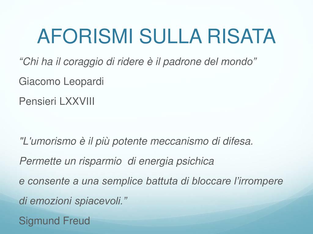 Aforismi sulla risata “Chi ha il coraggio di ridere è il padrone del mondo” Giacomo Leopardi Pensieri LXXVIII "L'umorismo è il più potente meccanismo di difesa. Permette un risparmio di energia psichica e consente a una semplice battuta di bloccare l’irrompere di emozioni spiacevoli.” Sigmund Freud