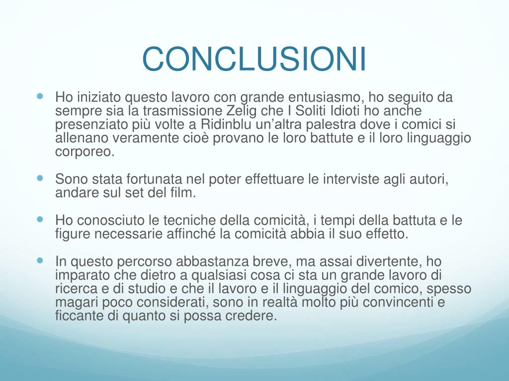 CONCLUSIONI • Ho iniziato questo lavoro con grande entusiasmo, ho seguito da sempre sia la trasmissione Zelig che I Soliti Idioti ho anche presenziato più volte a Ridinblu un’altra palestra dove i comici si allenano veramente cioè provano le loro battute e il loro linguaggio corporeo. • Sono stata fortunata nel poter effettuare le interviste agli autori, andare sul set del film. • Ho conosciuto le tecniche della comicità, i tempi della battuta e le figure necessarie affinché la comicità abbia il suo effetto. • In questo percorso abbastanza breve, ma assai divertente, ho imparato che dietro a qualsiasi cosa ci sta un grande lavoro di ricerca e di studio e che il lavoro e il linguaggio del comico, spesso magari poco considerati, sono in realtà molto più convincenti e ficcante di quanto si possa credere.
