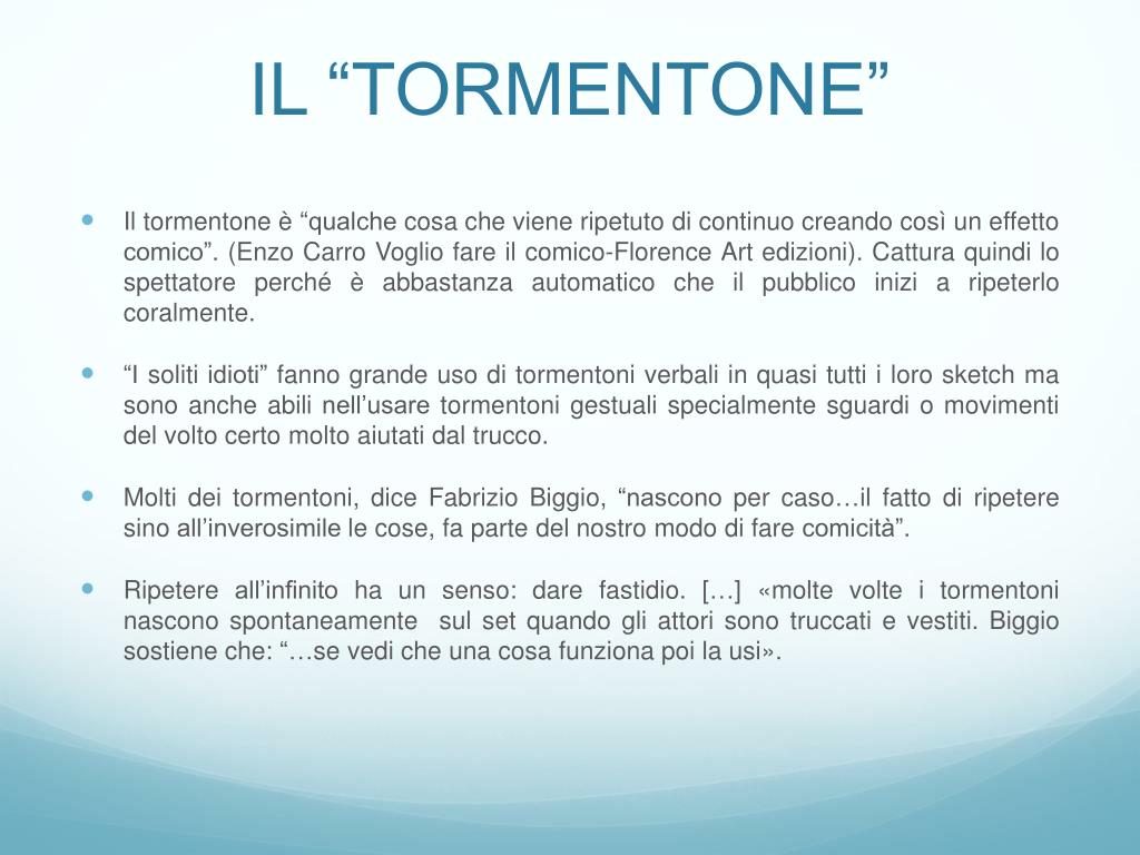 Il “Tormentone” • Il tormentone è “qualche cosa che viene ripetuto di continuo creando così un effetto comico”. (Enzo Carro Voglio fare il comico-Florence Art edizioni). Cattura quindi lo spettatore perché è abbastanza automatico che il pubblico inizi a ripeterlo coralmente. • “I soliti idioti” fanno grande uso di tormentoni verbali in quasi tutti i loro sketch ma sono anche abili nell’usare tormentoni gestuali specialmente sguardi o movimenti del volto certo molto aiutati dal trucco. • Molti dei tormentoni, dice Fabrizio Biggio, “nascono per caso…il fatto di ripetere sino all’inverosimile le cose, fa parte del nostro modo di fare comicità”. • Ripetere all’infinito ha un senso: dare fastidio. […] «molte volte i tormentoni nascono spontaneamente sul set quando gli attori sono truccati e vestiti. Biggio sostiene che: “…se vedi che una cosa funziona poi la usi».