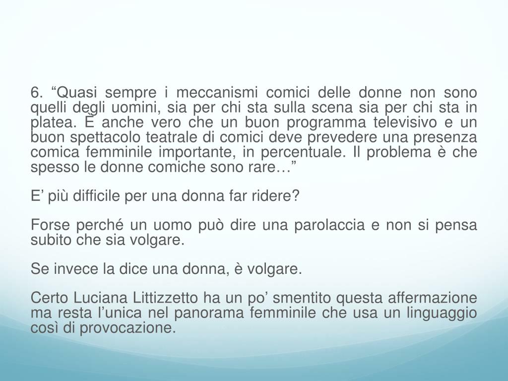 6. “Quasi sempre i meccanismi comici delle donne non sono quelli degli uomini, sia per chi sta sulla scena sia per chi sta in platea. È anche vero che un buon programma televisivo e un buon spettacolo teatrale di comici deve prevedere una presenza comica femminile importante, in percentuale. Il problema è che spesso le donne comiche sono rare…” E’ più difficile per una donna far ridere? Forse perché un uomo può dire una parolaccia e non si pensa subito che sia volgare. Se invece la dice una donna, è volgare. Certo Luciana Littizzetto ha un po’ smentito questa affermazione ma resta l’unica nel panorama femminile che usa un linguaggio così di provocazione.