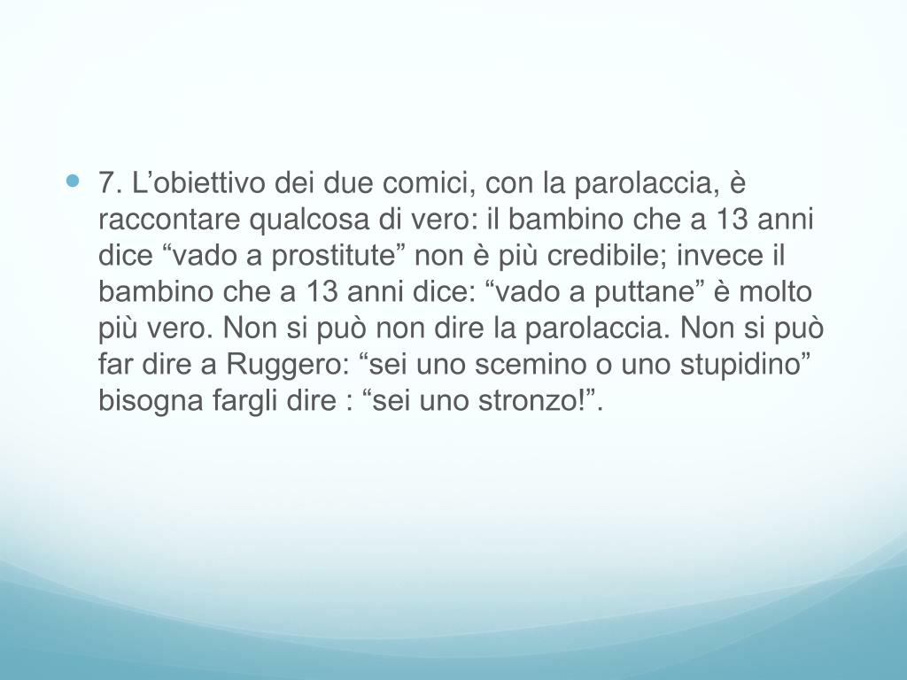 7. L’obiettivo dei due comici, con la parolaccia, è raccontare qualcosa di vero: il bambino che a 13 anni dice “vado a prostitute” non è più credibile; invece il bambino che a 13 anni dice: “vado a puttane” è molto più vero. Non si può non dire la parolaccia. Non si può far dire a Ruggero: “sei uno scemino o uno stupidino” bisogna fargli dire : “sei uno stronzo!”.