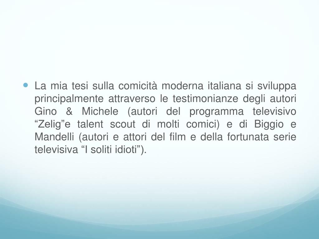La mia tesi sulla comicità moderna italiana si sviluppa principalmente attraverso le testimonianze degli autori Gino & Michele (autori del programma televisivo “Zelig”e talent scout di molti comici) e di Biggio e Mandelli (autori e attori del film e della fortunata serie televisiva “I soliti idioti”).