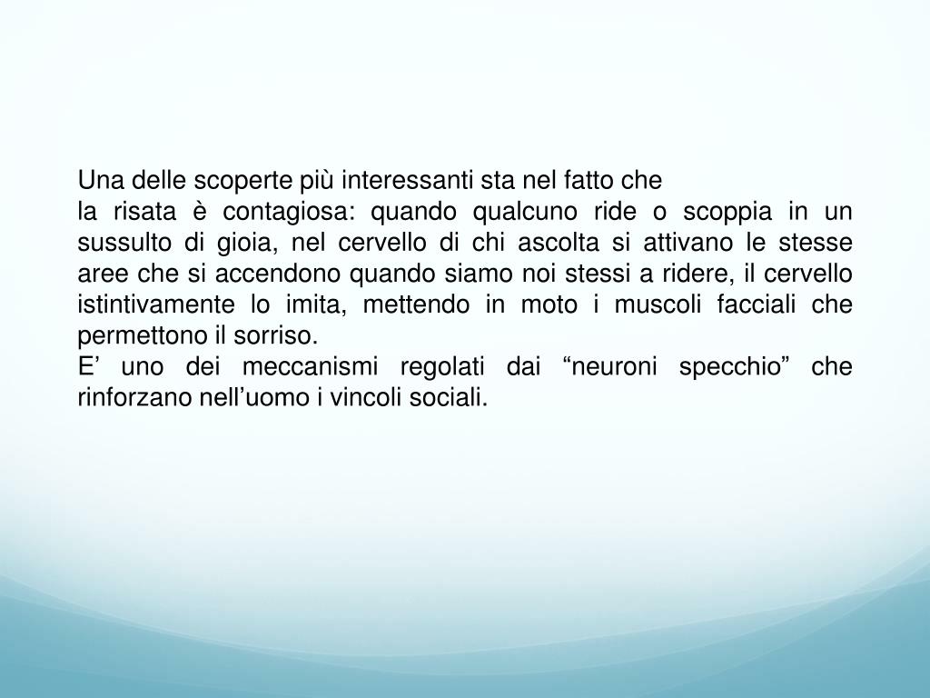 Una delle scoperte più interessanti sta nel fatto che la risata è contagiosa: quando qualcuno ride o scoppia in un sussulto di gioia, nel cervello di chi ascolta si attivano le stesse aree che si accendono quando siamo noi stessi a ridere, il cervello istintivamente lo imita, mettendo in moto i muscoli facciali che permettono il sorriso. E’ uno dei meccanismi regolati dai “neuroni specchio” che rinforzano nell’uomo i vincoli sociali.