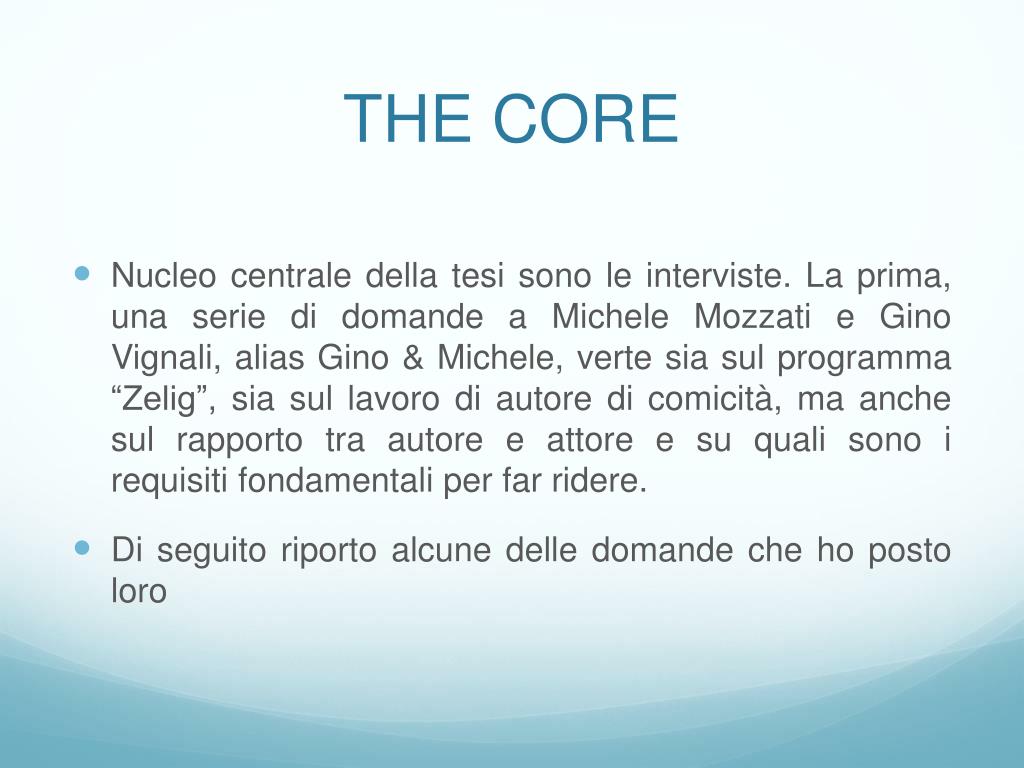 THE CORE • Nucleo centrale della tesi sono le interviste. La prima, una serie di domande a Michele Mozzati e Gino Vignali, alias Gino & Michele, verte sia sul programma “Zelig”, sia sul lavoro di autore di comicità, ma anche sul rapporto tra autore e attore e su quali sono i requisiti fondamentali per far ridere. • Di seguito riporto alcune delle domande che ho posto loro