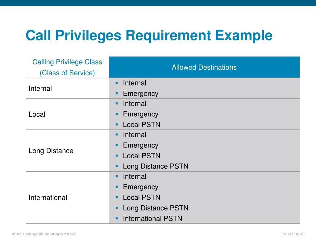 Outline Calling Privileges Overview Partitions and Calling Search Spaces Time Schedules and Time Periods Client Matter Codes and Forced Authorization Codes Calling Privileges Applications Overview Implementing Class of Service Implementing 911 and Vanity Numbers Implementing Time of Day-Based Carrier Selection Implementing Private Line, Automatic Ringdown