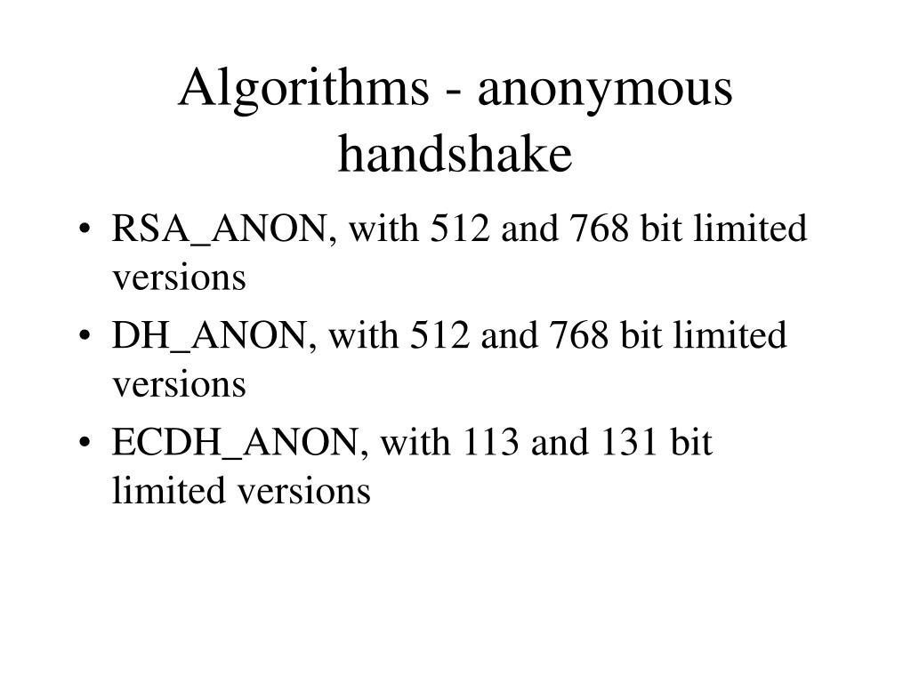 Algorithms - anonymous handshake • RSA_ANON, with 512 and 768 bit limited versions • DH_ANON, with 512 and 768 bit limited versions • ECDH_ANON, with 113 and 131 bit limited versions