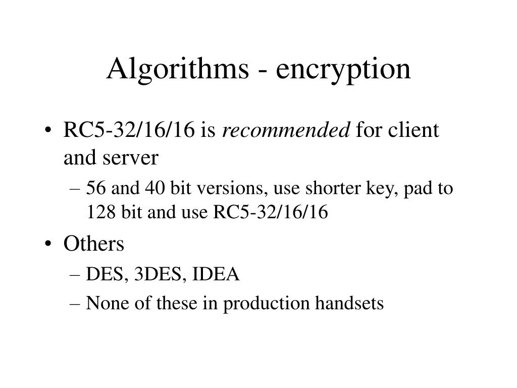 Algorithms - encryption • RC5-32/16/16 is recommended for client and server • 56 and 40 bit versions, use shorter key, pad to 128 bit and use RC5-32/16/16 • Others • DES, 3DES, IDEA • None of these in production handsets