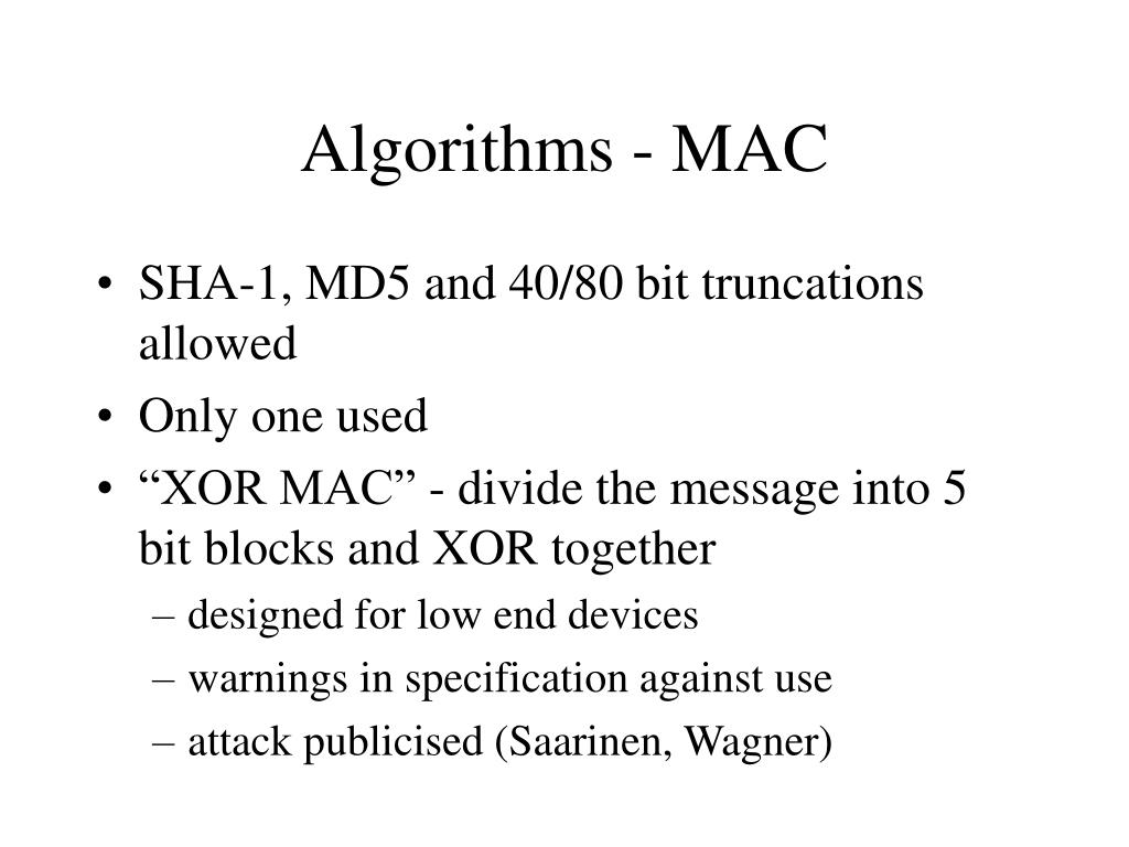 Algorithms - MAC • SHA-1, MD5 and 40/80 bit truncations allowed • Only one used • “XOR MAC” - divide the message into 5 bit blocks and XOR together • designed for low end devices • warnings in specification against use • attack publicised (Saarinen, Wagner)