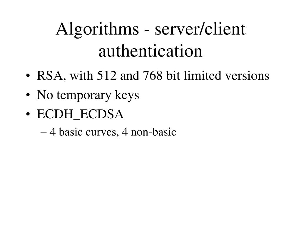 Algorithms - server/client authentication • RSA, with 512 and 768 bit limited versions • No temporary keys • ECDH_ECDSA • 4 basic curves, 4 non-basic