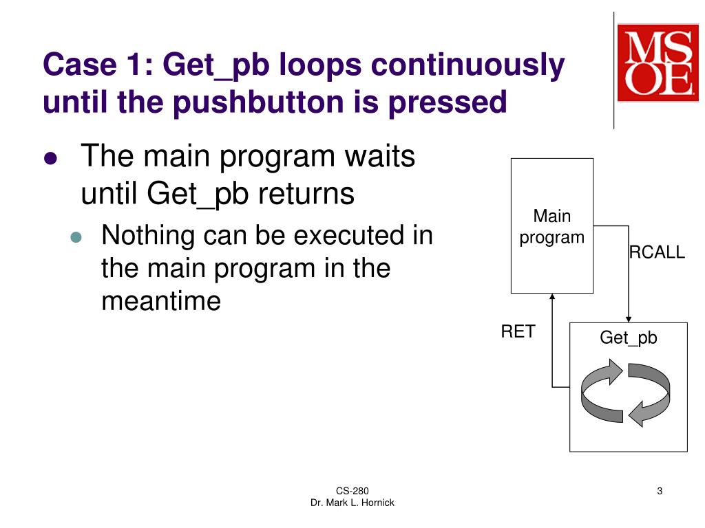 Case 1: Get_pb loops continuously until the pushbutton is pressed • The main program waits until Get_pb returns • Nothing can be executed in the main program in the meantime Mainprogram RCALL RET Get_pb CS-280 Dr. Mark L. Hornick