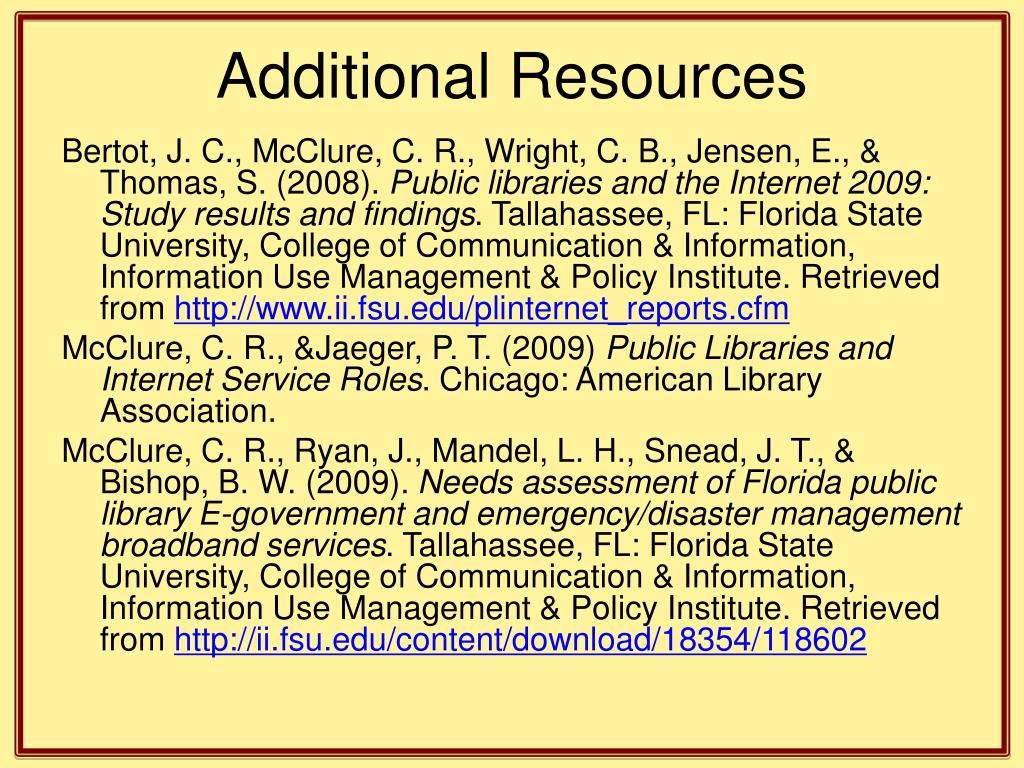 Additional Resources Bertot, J. C., McClure, C. R., Wright, C. B., Jensen, E., & Thomas, S. (2008). Public libraries and the Internet 2009: Study results and findings. Tallahassee, FL: Florida State University, College of Communication & Information, Information Use Management & Policy Institute. Retrieved from http://www.ii.fsu.edu/plinternet_reports.cfm McClure, C. R., &Jaeger, P. T. (2009) Public Libraries and Internet Service Roles. Chicago: American Library Association. McClure, C. R., Ryan, J., Mandel, L. H., Snead, J. T., & Bishop, B. W. (2009). Needs assessment of Florida public library E-government and emergency/disaster management broadband services. Tallahassee, FL: Florida State University, College of Communication & Information, Information Use Management & Policy Institute. Retrieved from http://ii.fsu.edu/content/download/18354/118602
