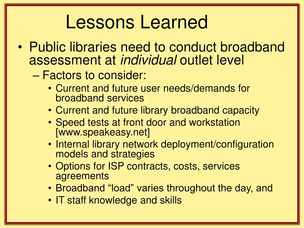 Lessons Learned • Public libraries need to conduct broadband assessment at individual outlet level • Factors to consider: • Current and future user needs/demands for broadband services • Current and future library broadband capacity • Speed tests at front door and workstation [www.speakeasy.net] • Internal library network deployment/configuration models and strategies • Options for ISP contracts, costs, services agreements • Broadband “load” varies throughout the day, and • IT staff knowledge and skills