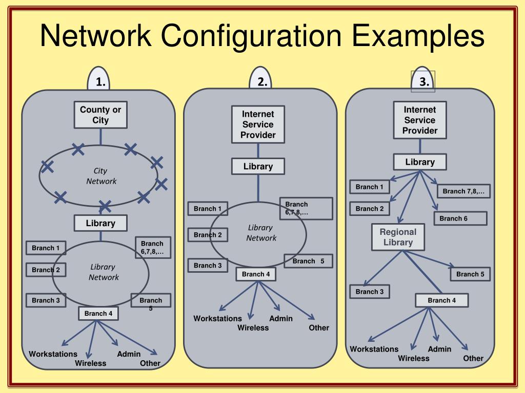Network Configuration Examples 1. 2. 3. County or City Internet Service Provider Internet Service Provider × × × × Library Library City Network × × × Branch 1 Branch 7,8,… × Branch 6,7,8,… Branch 1 Branch 2 Branch 6 Library Library Network Regional Library Branch 2 Branch 6,7,8,… Branch 1 Branch 5 Library Network Branch 3 Branch 2 Branch 4 Branch 5 Branch 3 Branch 3 Branch 5 Branch 4 Branch 4 Workstations Admin Wireless Other Workstations Admin Wireless Other Workstations Admin Wireless Other
