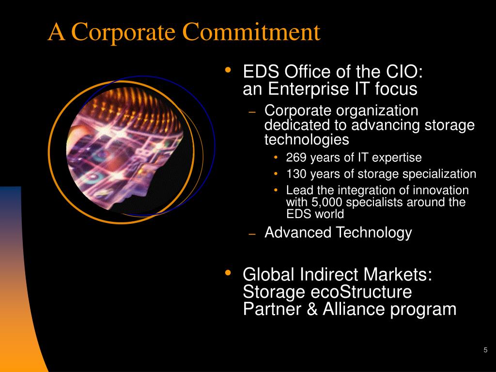 A Corporate Commitment • EDS Office of the CIO:an Enterprise IT focus • Corporate organization dedicated to advancing storage technologies • 269 years of IT expertise • 130 years of storage specialization • Lead the integration of innovation with 5,000 specialists around the EDS world • Advanced Technology • Global Indirect Markets: Storage ecoStructure Partner & Alliance program