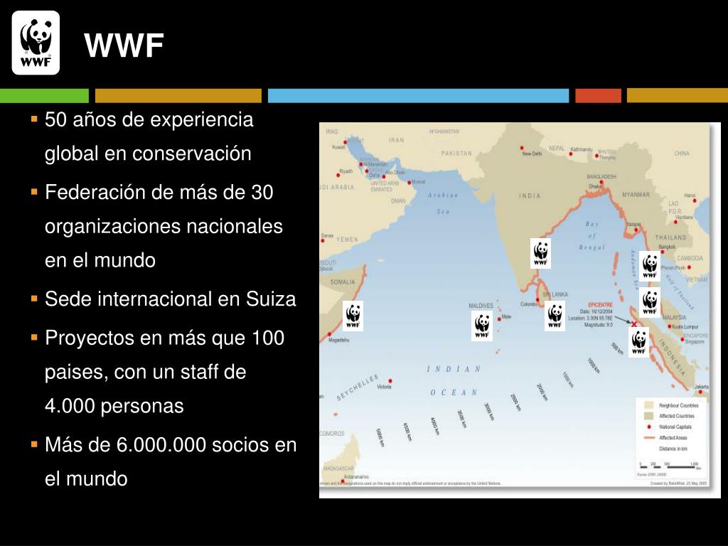 WWF • 50 años de experiencia global en conservación • Federación de más de 30 organizaciones nacionales en el mundo • Sede internacional en Suiza • Proyectos en más que 100 paises, con un staff de 4.000 personas • Más de 6.000.000 socios en el mundo