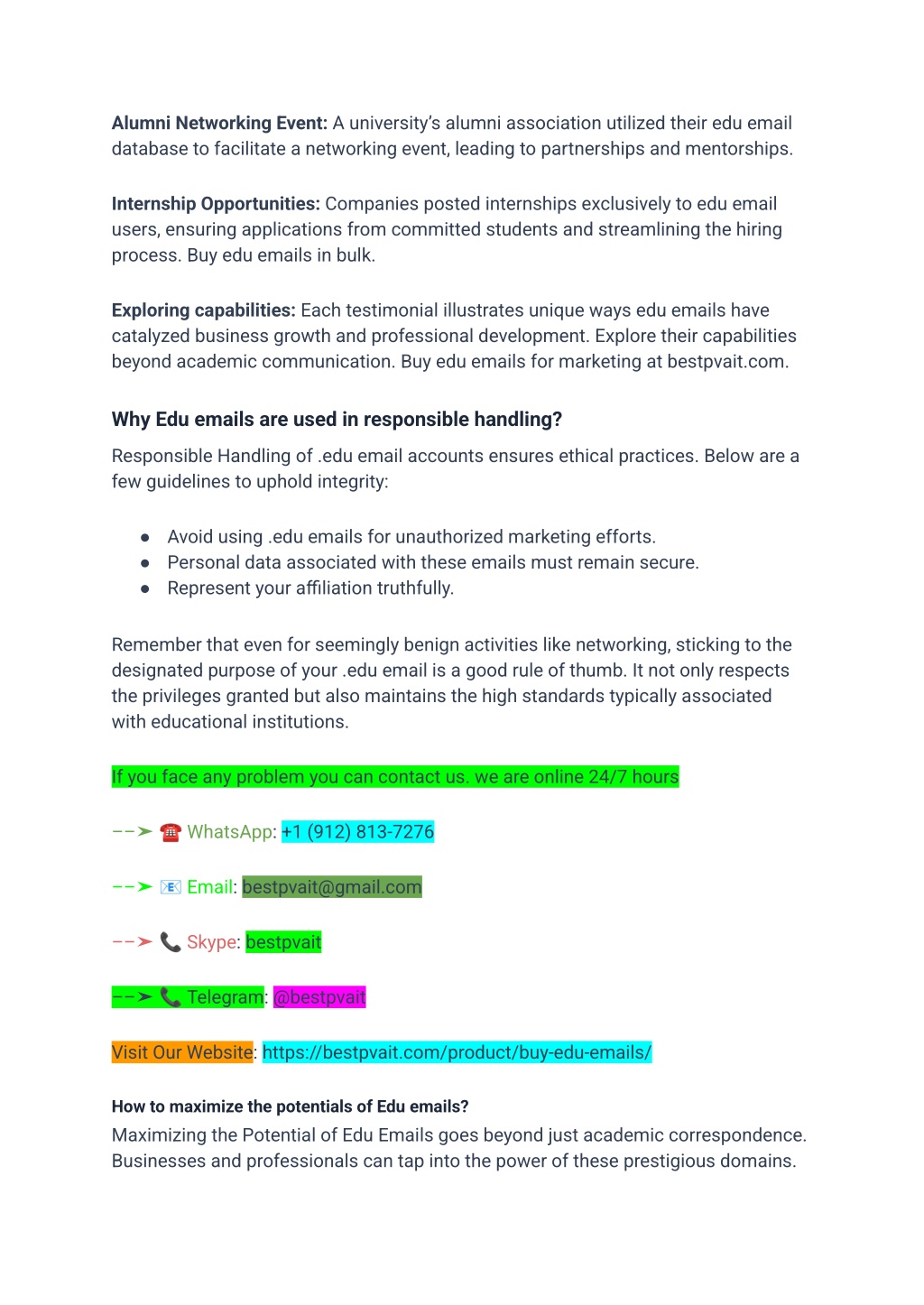 Alumni Networking Event: A university’s alumni association utilized their edu email database to facilitate a networking event, leading to partnerships and mentorships. Internship Opportunities: Companies posted internships exclusively to edu email users, ensuring applications from committed students and streamlining the hiring process. Buy edu emails in bulk. Exploring capabilities: Each testimonial illustrates unique ways edu emails have catalyzed business growth and professional development. Explore their capabilities beyond academic communication. Buy edu emails for marketing at bestpvait.com. Why Edu emails are used in responsible handling? Responsible Handling of .edu email accounts ensures ethical practices. Below are a few guidelines to uphold integrity: ● Avoid using .edu emails for unauthorized marketing efforts. ● Personal data associated with these emails must remain secure. ● Represent your affiliation truthfully. Remember that even for seemingly benign activities like networking, sticking to the designated purpose of your .edu email is a good rule of thumb. It not only respects the privileges granted but also maintains the high standards typically associated with educational institutions. If you face any problem you can contact us. we are online 24/7 hours ––➤☎ WhatsApp: +1 (912) 813-7276 ––➤? Email: bestpvait@gmail.com ––➤? Skype: bestpvait ––➤? Telegram: @bestpvait Visit Our Website: https://bestpvait.com/product/buy-edu-emails/ How to maximize the potentials of Edu emails? Maximizing the Potential of Edu Emails goes beyond just academic correspondence. Businesses and professionals can tap into the power of these prestigious domains.
