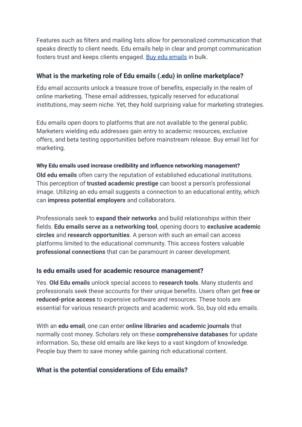 Features such as filters and mailing lists allow for personalized communication that speaks directly to client needs. Edu emails help in clear and prompt communication fosters trust and keeps clients engaged. Buy edu emails in bulk. What is the marketing role of Edu emails (.edu) in online marketplace? Edu email accounts unlock a treasure trove of benefits, especially in the realm of online marketing. These email addresses, typically reserved for educational institutions, may seem niche. Yet, they hold surprising value for marketing strategies. Edu emails open doors to platforms that are not available to the general public. Marketers wielding edu addresses gain entry to academic resources, exclusive offers, and beta testing opportunities before mainstream release. Buy email list for marketing. Why Edu emails used increase credibility and influence networking management? Old edu emails often carry the reputation of established educational institutions. This perception of trusted academic prestige can boost a person’s professional image. Utilizing an edu email suggests a connection to an educational entity, which can impress potential employers and collaborators. Professionals seek to expand their networks and build relationships within their fields. Edu emails serve as a networking tool, opening doors to exclusive academic circles and research opportunities. A person with such an email can access platforms limited to the educational community. This access fosters valuable professional connections that can be paramount in career development. Is edu emails used for academic resource management? Yes. Old Edu emails unlock special access to research tools. Many students and professionals seek these accounts for their unique benefits. Users often get free or reduced-price access to expensive software and resources. These tools are essential for various research projects and academic work. So, buy old edu emails. With an edu email, one can enter online libraries and academic journals that normally cost money. Scholars rely on these comprehensive databases for update information. So, these old emails are like keys to a vast kingdom of knowledge. People buy them to save money while gaining rich educational content. What is the potential considerations of Edu emails?