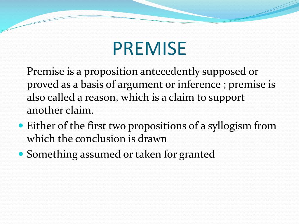 PREMISE Premise is a proposition antecedently supposed or proved as a basis of argument or inference ; premise is also called a reason, which is a claim to support another claim. • Either of the first two propositions of a syllogism from which the conclusion is drawn • Something assumed or taken for granted