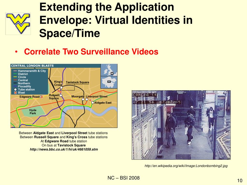 Extending the Application Envelope: Virtual Identities in Space/Time • Correlate Two Surveillance Videos Between Aldgate East and Liverpool Street tube stations Between Russell Square and King's Cross tube stations At Edgware Road tube station On bus at Tavistock Square http://news.bbc.co.uk/1/hi/uk/4661059.stm http://en.wikipedia.org/wiki/Image:Londonbombing2.jpg NC – BSI 2008