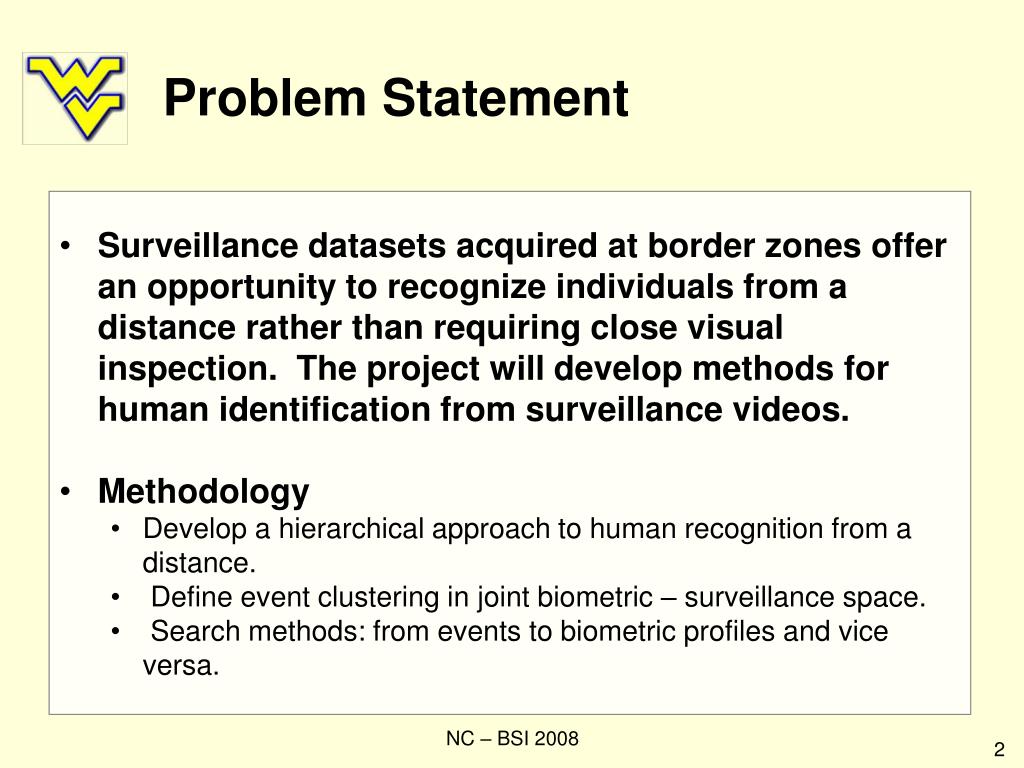 Problem Statement • Surveillance datasets acquired at border zones offer an opportunity to recognize individuals from a distance rather than requiring close visual inspection. The project will develop methods for human identification from surveillance videos. • Methodology • Develop a hierarchical approach to human recognition from a distance. • Define event clustering in joint biometric – surveillance space. • Search methods: from events to biometric profiles and vice versa. NC – BSI 2008