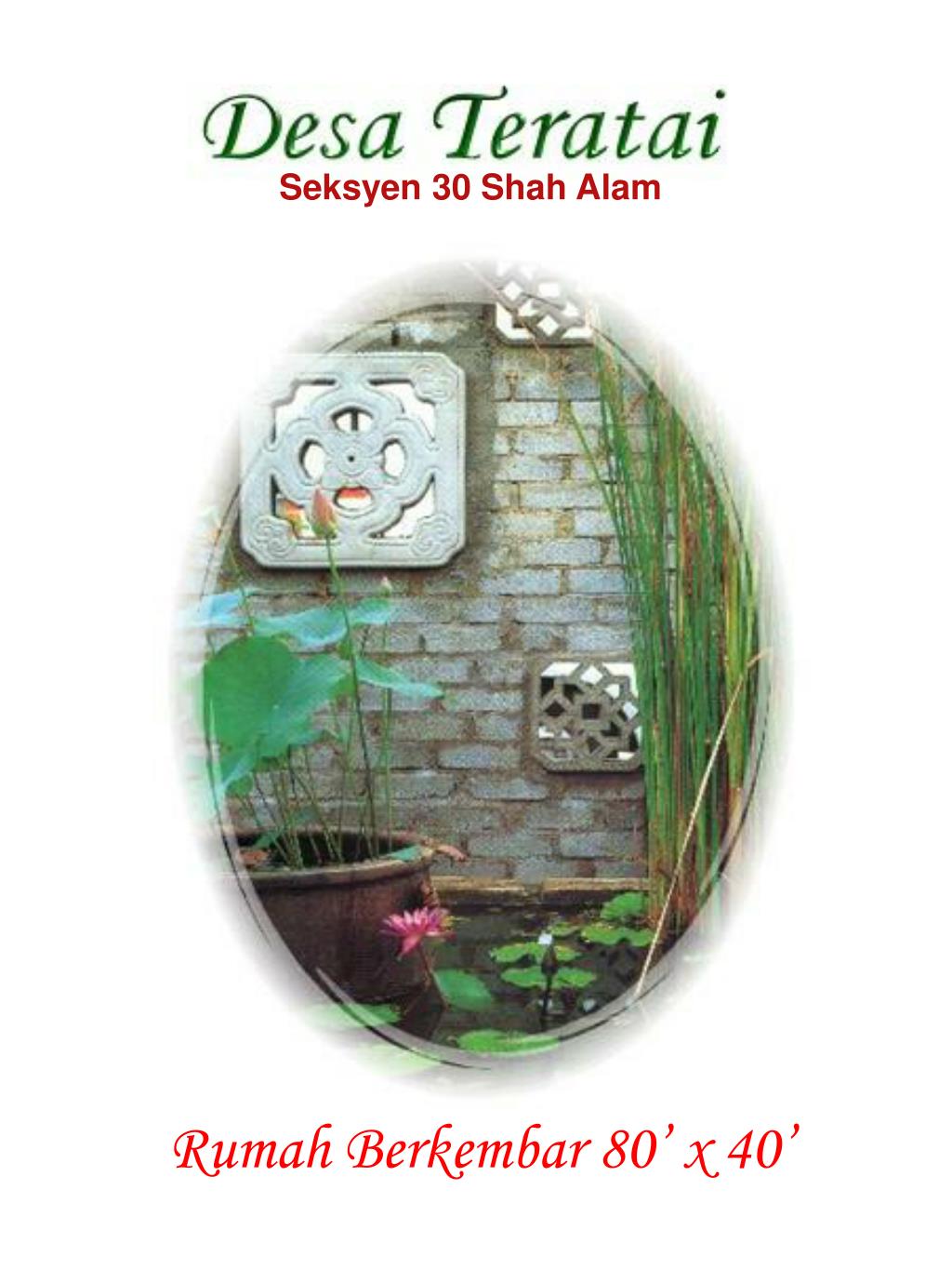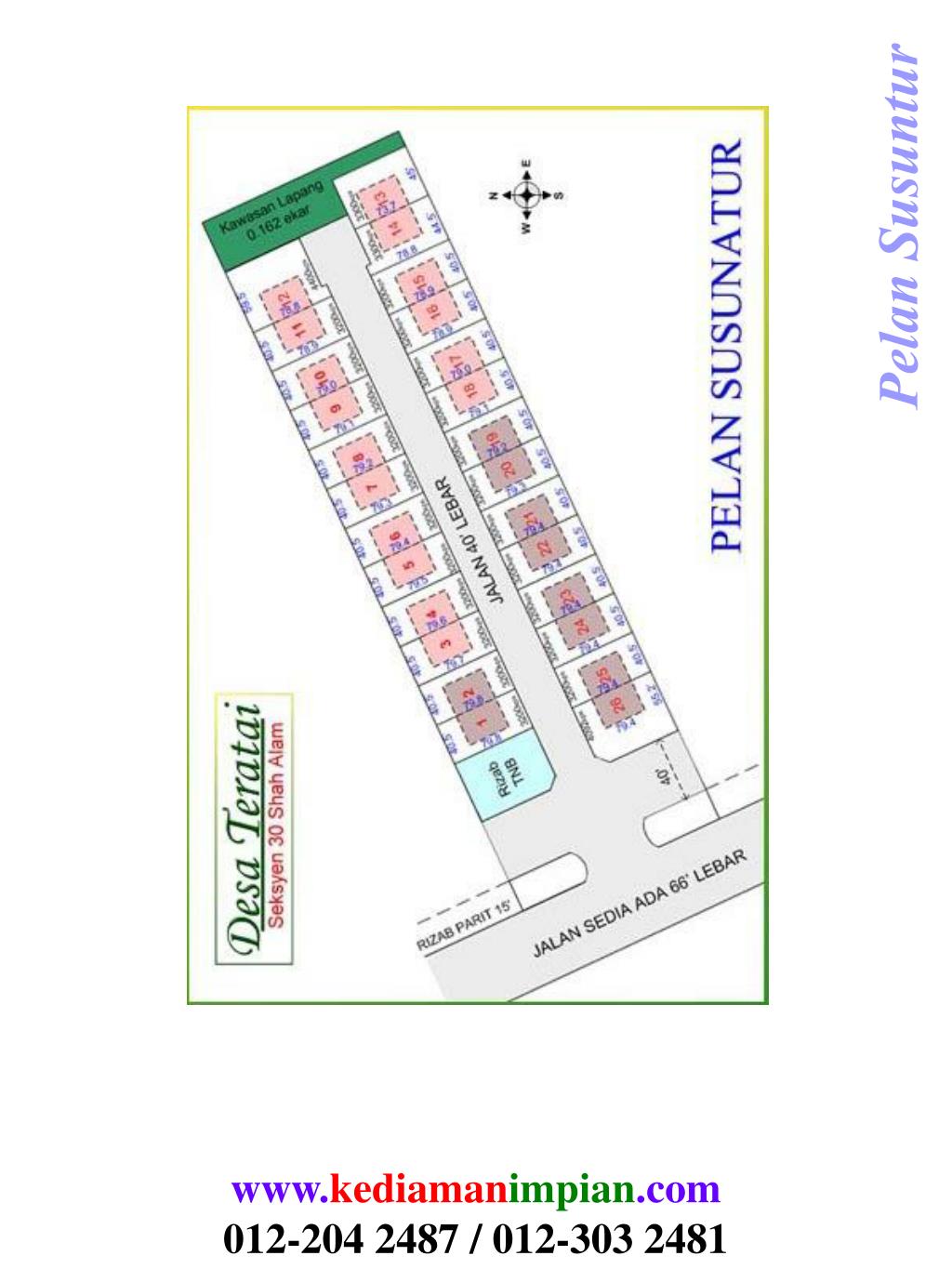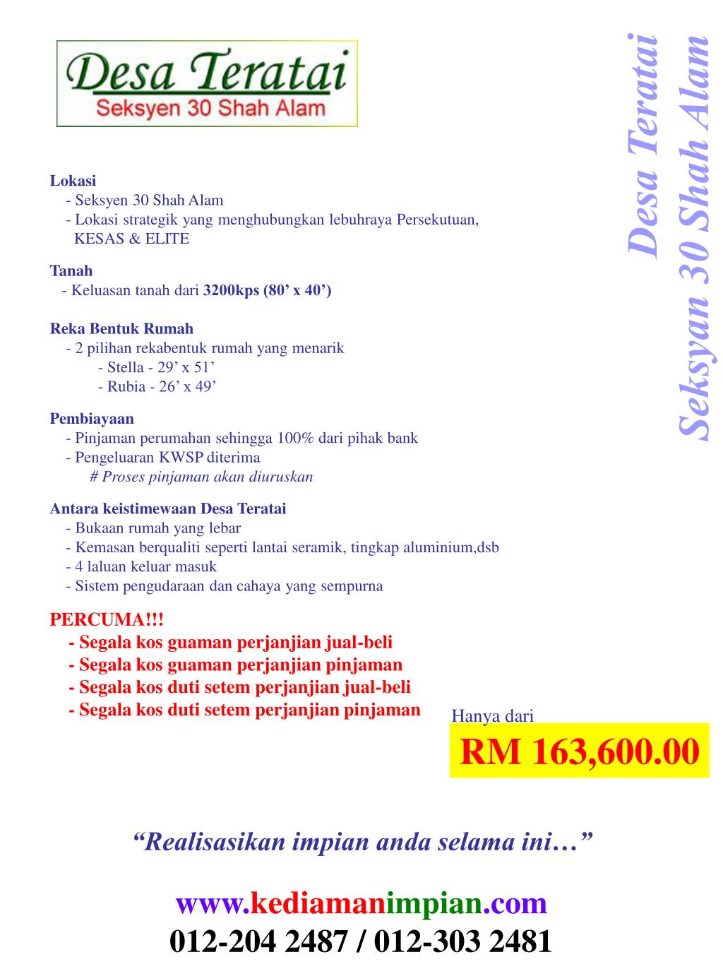 Lokasi - Seksyen 30 Shah Alam - Lokasi strategik yang menghubungkan lebuhraya Persekutuan, KESAS & ELITE Tanah - Keluasan tanah dari 3200kps (80’ x 40’) Reka Bentuk Rumah - 2 pilihan rekabentuk rumah yang menarik - Stella - 29’ x 51’ - Rubia - 26’ x 49’ Pembiayaan - Pinjaman perumahan sehingga 100% dari pihak bank - Pengeluaran KWSP diterima # Proses pinjaman akan diuruskan Antara keistimewaan Desa Teratai - Bukaan rumah yang lebar - Kemasan berqualiti seperti lantai seramik, tingkap aluminium,dsb - 4 laluan keluar masuk - Sistem pengudaraan dan cahaya yang sempurna PERCUMA!!! - Segala kos guaman perjanjian jual-beli - Segala kos guaman perjanjian pinjaman - Segala kos duti setem perjanjian jual-beli - Segala kos duti setem perjanjian pinjaman Desa Teratai Seksyan 30 Shah Alam Hanya dari RM 163,600.00 “Realisasikan impian anda selama ini…” www.kediamanimpian.com 012-204 2487 / 012-303 2481