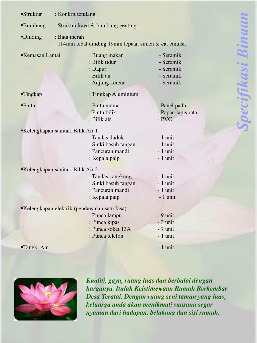 Struktur : Konkrit tetulang • Bumbung : Struktur kayu & bumbung genting • Dinding : Bata merah 114mm tebal dinding 19mm lepaan simen & cat emulsi. • Kemasan Lantai : Ruang makan - Seramik : Bilik tidur - Seramik • : Dapur - Seramik • : Bilik air - Seramik • : Anjung kereta - Seramik • Tingkap : Tingkap Aluminium • Pintu : Pintu utama - Panel padu • : Pintu bilik - Papan lapis rata • : Bilik air - PVC • Kelengkapan sanitari Bilik Air 1 • : Tandas duduk - 1 unit • : Sinki basuh tangan - 1 unit • : Pancuran mandi - 1 unit • : Kepala paip - 1 unit • Kelengkapan sanitari Bilik Air 2 • : Tandas cangkung - 1 unit • : Sinki basuh tangan - 1 unit • : Pancuran mandi - 1 unit • : Kepala paip - 1 unit • Kelengkapan elektrik (pendawaian satu fasa) • : Punca lampu - 9 unit • : Punca kipas - 3 unit • : Punca soket 13A - 7 unit • : Punca telefon - 1 unit • Tangki Air - 1 unit Specifikasi Binaan Kualiti, gaya, ruang luas dan berbaloi dengan harganya. Itulah Keistimewaan Rumah Berkembar Desa Teratai. Dengan ruang seni taman yang luas, keluarga anda akan menikmati suasana segar nyaman dari hadapan, belakang dan sisi rumah.
