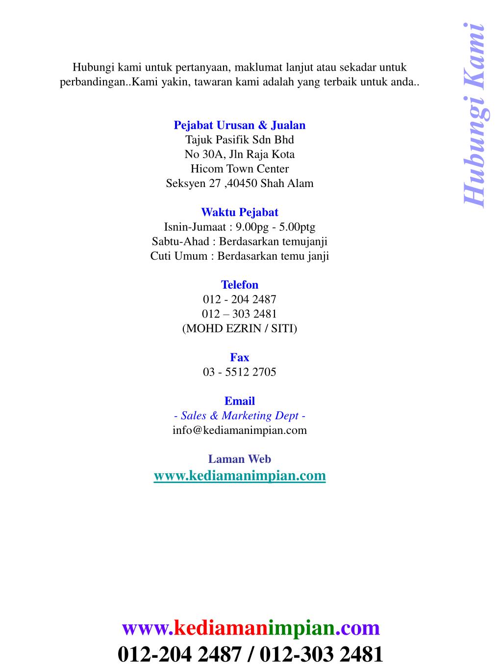 Hubungi kami untuk pertanyaan, maklumat lanjut atau sekadar untuk perbandingan..Kami yakin, tawaran kami adalah yang terbaik untuk anda.. Pejabat Urusan & JualanTajuk Pasifik Sdn BhdNo 30A, Jln Raja KotaHicom Town CenterSeksyen 27 ,40450 Shah Alam Waktu PejabatIsnin-Jumaat : 9.00pg - 5.00ptgSabtu-Ahad : Berdasarkan temujanjiCuti Umum : Berdasarkan temu janji Telefon012 - 204 2487012 – 303 2481 (MOHD EZRIN / SITI)Fax03 - 5512 2705 Email- Sales & Marketing Dept -info@kediamanimpian.com Laman Web www.kediamanimpian.com Hubungi Kami www.kediamanimpian.com 012-204 2487 / 012-303 2481