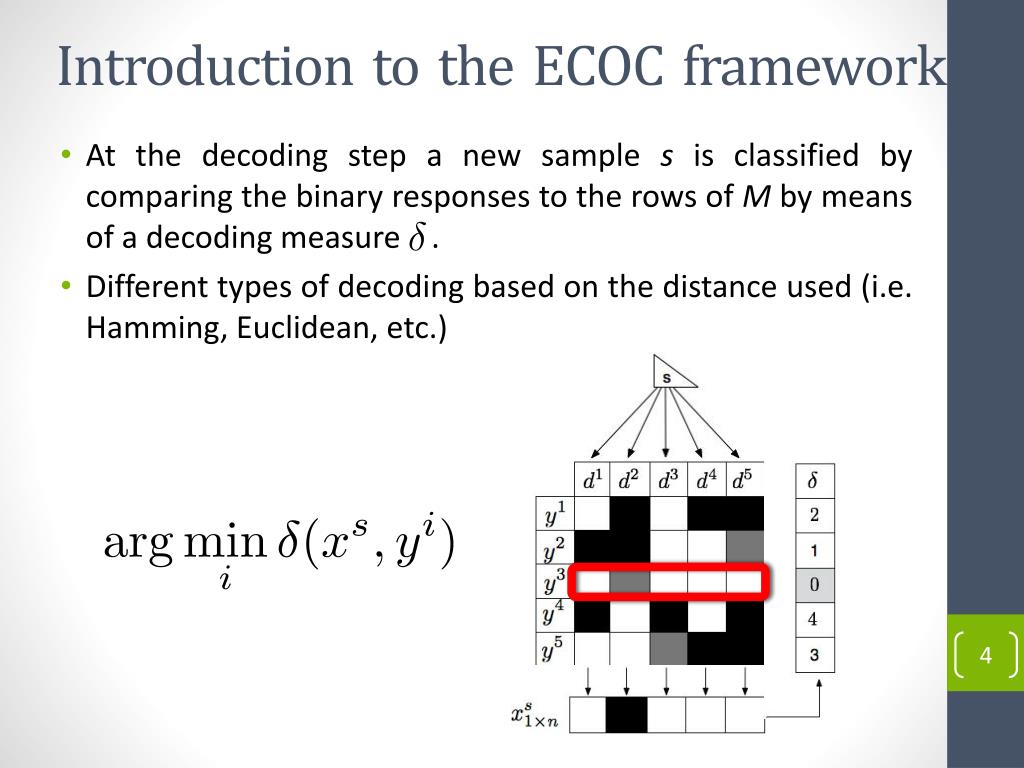 Introduction to the ECOC framework • At the decoding step a new sample s is classified by comparing the binary responses to the rows of M by means of a decoding measure . • Different types of decoding based on the distance used (i.e. Hamming, Euclidean, etc.)