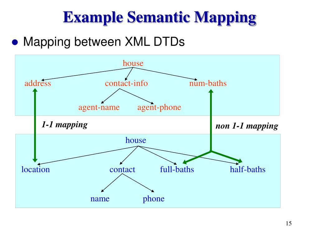 Example Semantic Mapping • Mapping between XML DTDs house address contact-info num-baths agent-nameagent-phone 1-1 mapping non 1-1 mapping house location contact full-baths half-baths name phone