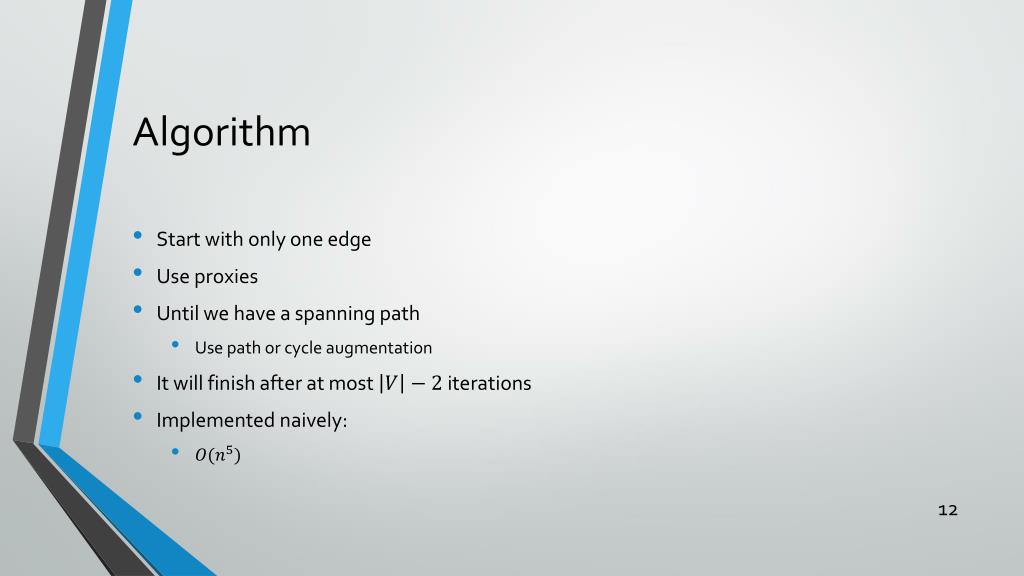 Algorithm • Start with only one edge • Use proxies • Until we have a spanning path • Use path or cycle augmentation • It will finish after at most iterations • Implemented naively:
