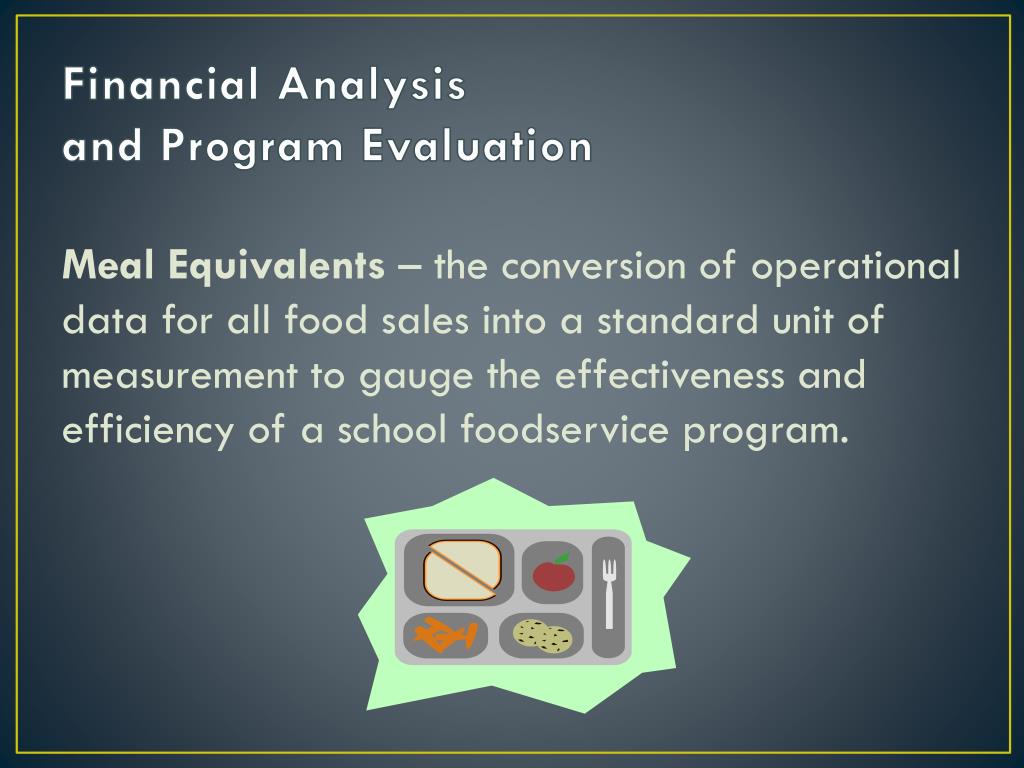 Financial Analysis and Program Evaluation Meal Equivalents – the conversion of operational data for all food sales into a standard unit of measurement to gauge the effectiveness and efficiency of a school foodservice program.