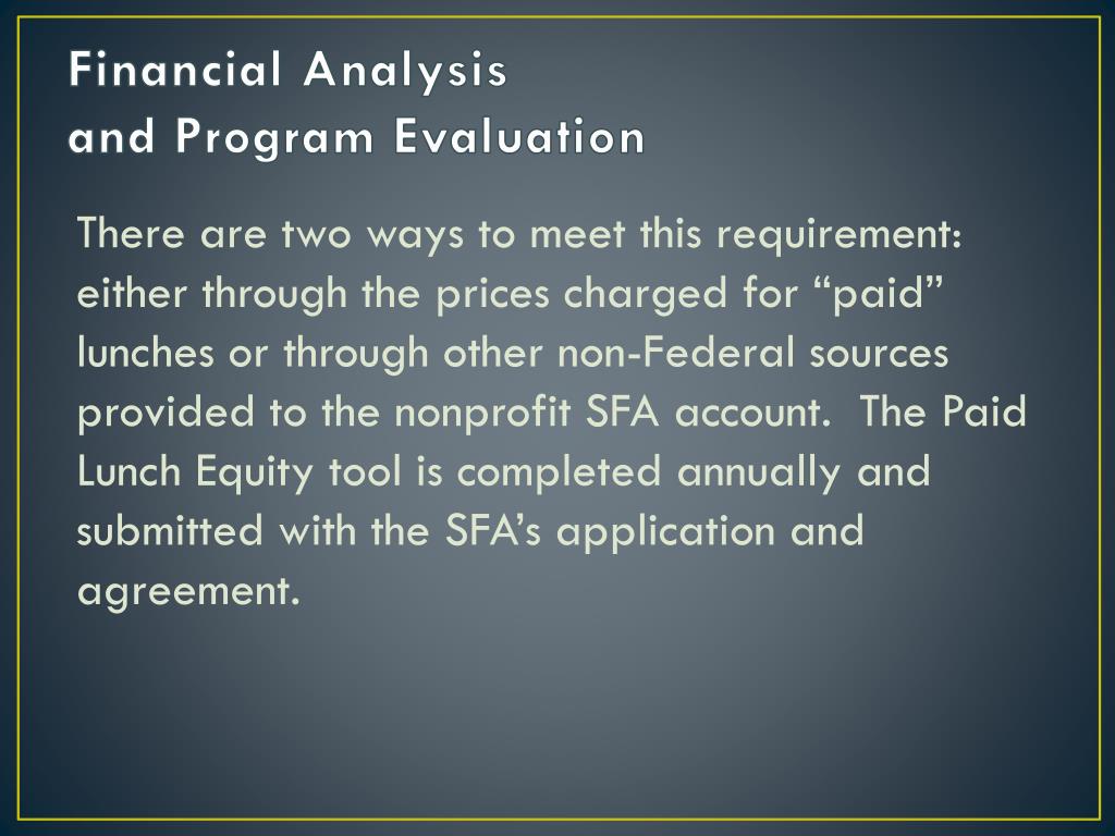 Financial Analysis and Program Evaluation There are two ways to meet this requirement: either through the prices charged for “paid” lunches or through other non-Federal sources provided to the nonprofit SFA account. The Paid Lunch Equity tool is completed annually and submitted with the SFA’s application and agreement.